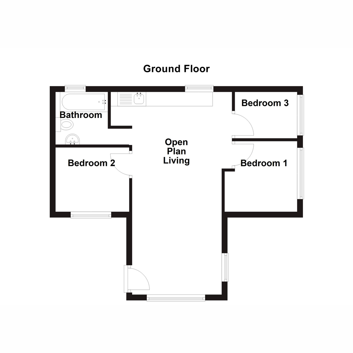 Open Plan Living 23'5" x 11'5" (7.15m x 3.50m)Open plan living space with uPVC double glazed windows to front, side, and rear, fitted with a kitchen unit containing a fitted electric oven, four ring electric hob with extractor hood over, single drain stainless steel sink unit, integrated dishwasher, doors to: